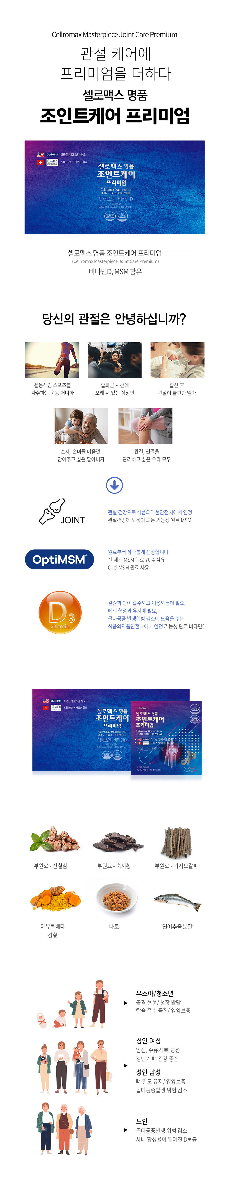 | 주요성분 | 엠에스엠(MSM, Methyl sulfonylmethane, 디메틸설폰), 비타민D |